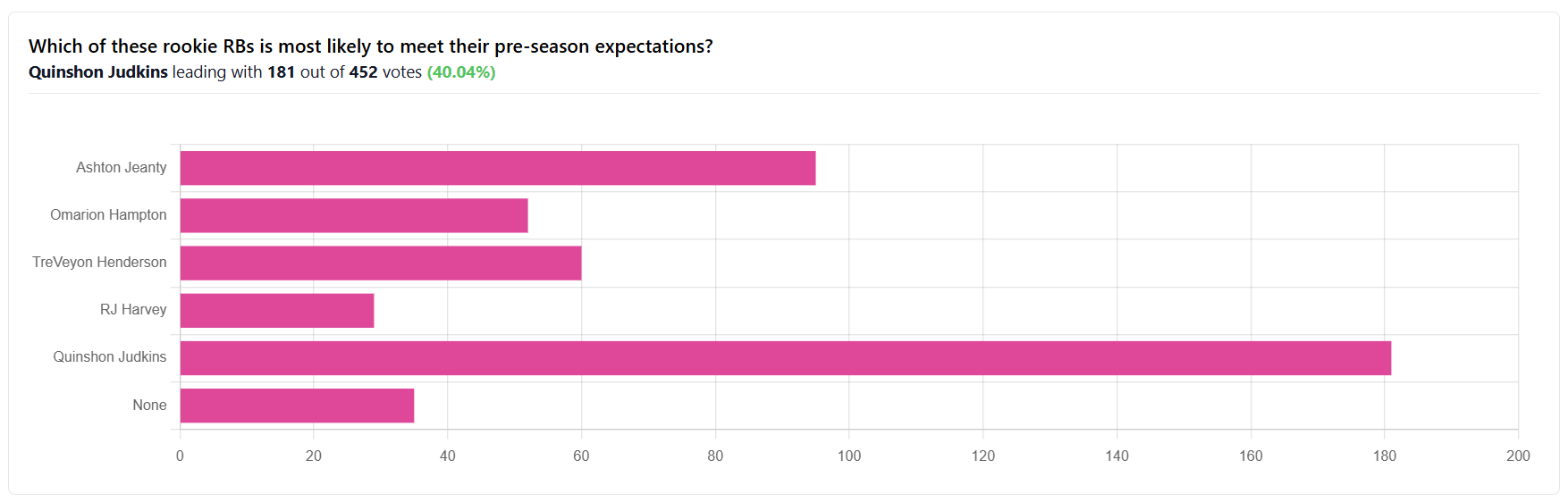 As for the other RBs, we always needed to have more reasonable expectations for 2nd and 3rd round RBs. I will mention to those who selected Judkins below, keep in mind there is still a substantial chance he ends up with a suspension this year and overall offensive downgrade when Flacco is benched.