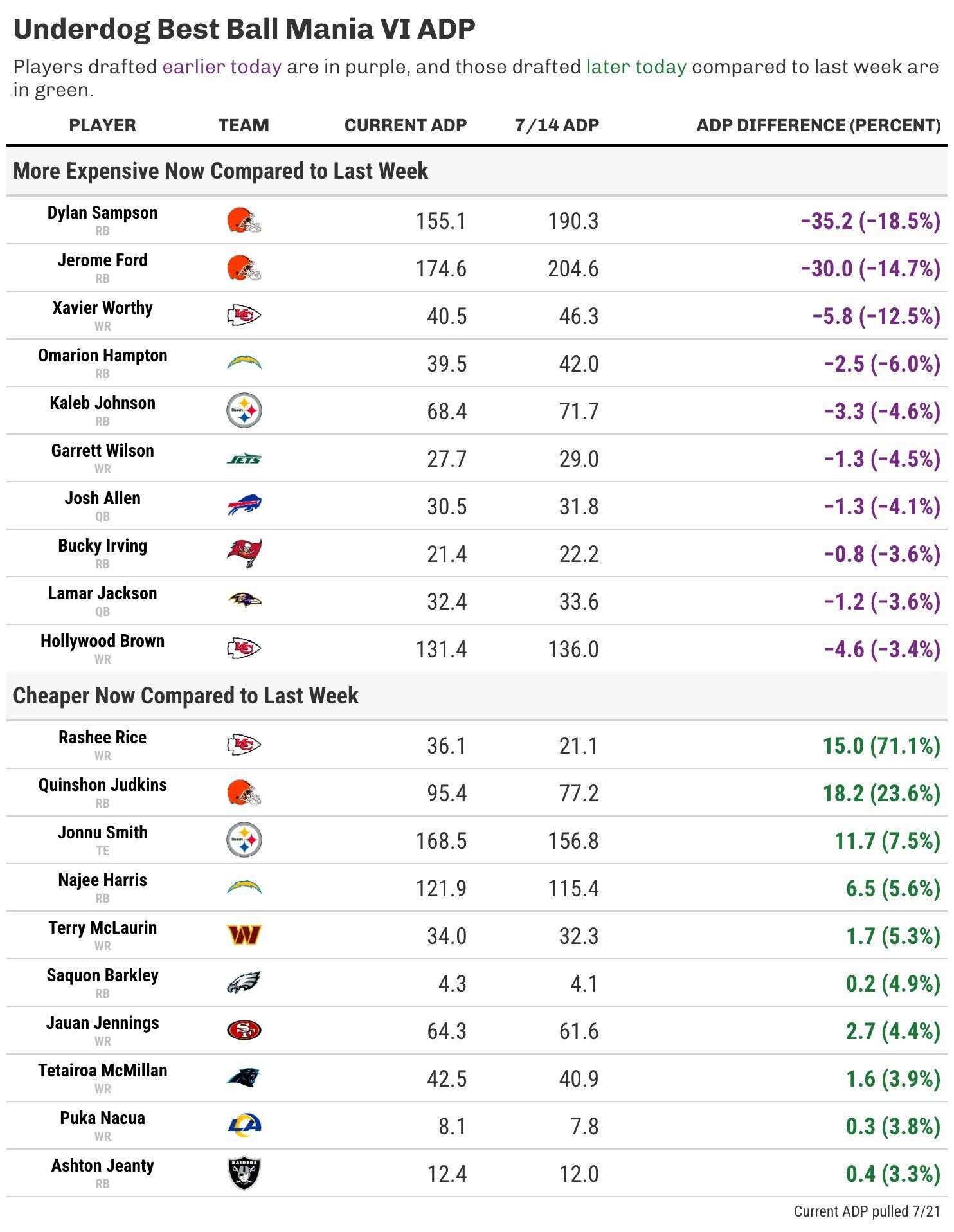 The general theme for this week’s fallers continues to be an overarching trend: it takes longer for players to fall than rise. To rise, you just need one person to reach. To fall, you need everyone to pass, and continue passing when they see the supposed ADP value, all while avoiding the autodraft picks. My general recommended strategy in these situations is to avoid the falling knife. This is my current stance on Rashee Rice, Quinshon Judkins, Jonnu Smith, and Najee Harris as they are still feeling the effects of their likely suspensions, recent trades, or unknown injury.