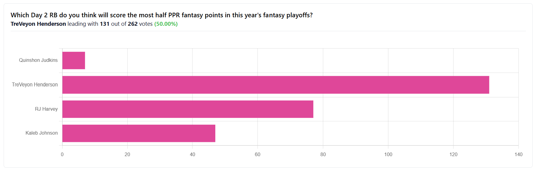 I’m a bit surprised by the results of yesterday’s poll. Kaleb Johnson finished about where I expected but I was thinking it’d be far closer between Harvey and Henderson given half PPR scoring. Both have similar ADPs and similar competition for the backfield. Henderson the better prospect but Harvey likely on the better offense. Definitely a close call in my mind. I’m also a bit surprised Judkins didn’t get more love given it asked about just the fantasy playoffs meaning an early suspension wouldn’t crush his opportunity. But I think this shows the overall bearish feeling towards him and the situation.
