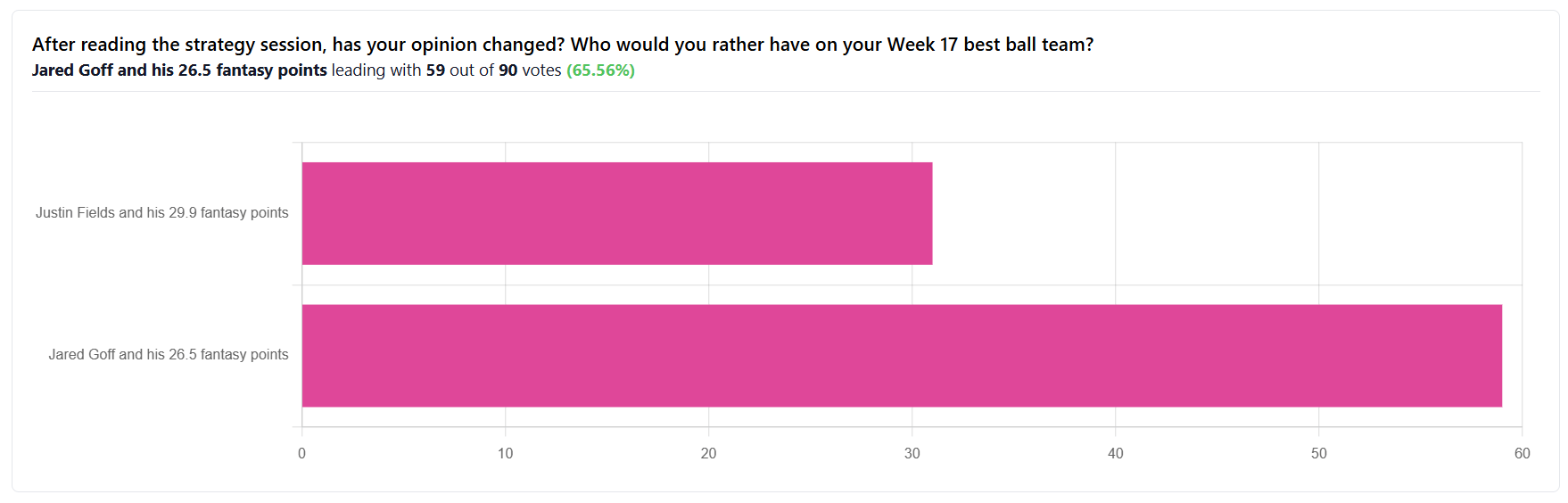Voting on Goff vs Fields shifted from ~60% in favor of Fields to ~66% in favor of Goff. Noted. Glad to see the ‘Strategy Session’ was valuable and I’ll look to work more in as appropriate.