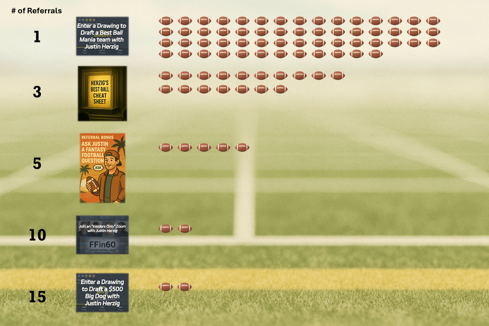 3 Referrals: Receive Justin Herzig’s 2025 60 Second Best Ball Cheat Sheet