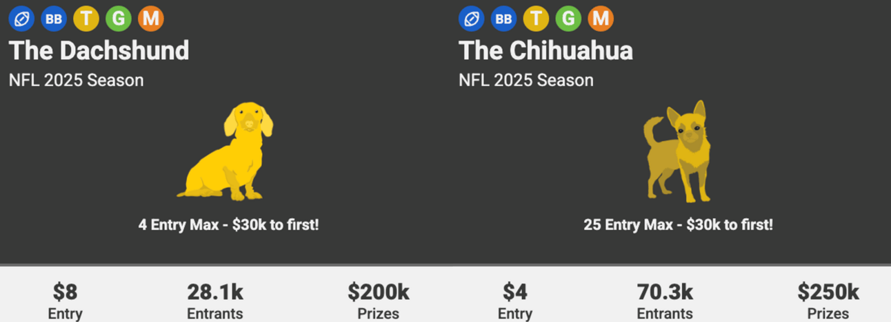 Underdog launched two new limited-entry contests over the weekend, the $8 Dachshund and the $4 Chihuahua. I’m expecting the Chihuahua to fill either Monday or Tuesday with the Dachshund by the end of the week.