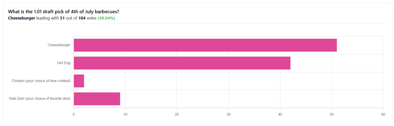 Hope everyone had a fantastic 4th of July! My apologies for not including ribs, definitely a miss, but they still had no chance against the burger or hot dog. Shoutout Joey Chestnut for further cementing himself as the competition-eating GOAT.