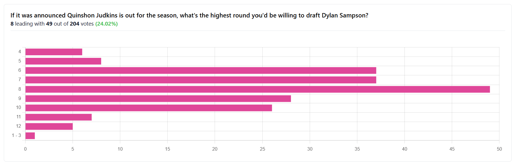 I think these type of hypotheticals are both interesting and insightful for drafting. It can help us understand how the market value’s a player’s upside (or whatever contingent risk). Round 8 would put Sampson next to Brian Robinson and Jordan Mason which in my opinion, is actually probably a round too low.