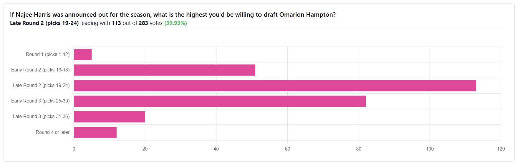 Another fun hypothetical yesterday for where first rounder Omarion Hampton would be commonly drafted if Najee was out for the season. He doesn’t have as high of draft capital or as good a talent profile as Jeanty. And the Chargers is a great landing spot but not elite given the lack of throwing to RBs. So I wouldn’t be able to move him into the first round but definitely would see him in the 2nd round. Probably above JT and Bucky Irving but behind Achane and Henry. Will be interesting to see how this all plays out as we get more updates on Najee.