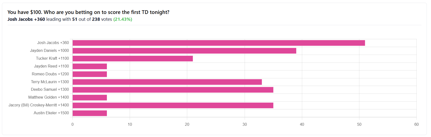 Based off how FFin60 readers voted, sports books must have cleaned up on first TD bets as Romeo Doubs (2.5% of the votes) caught the first TD.