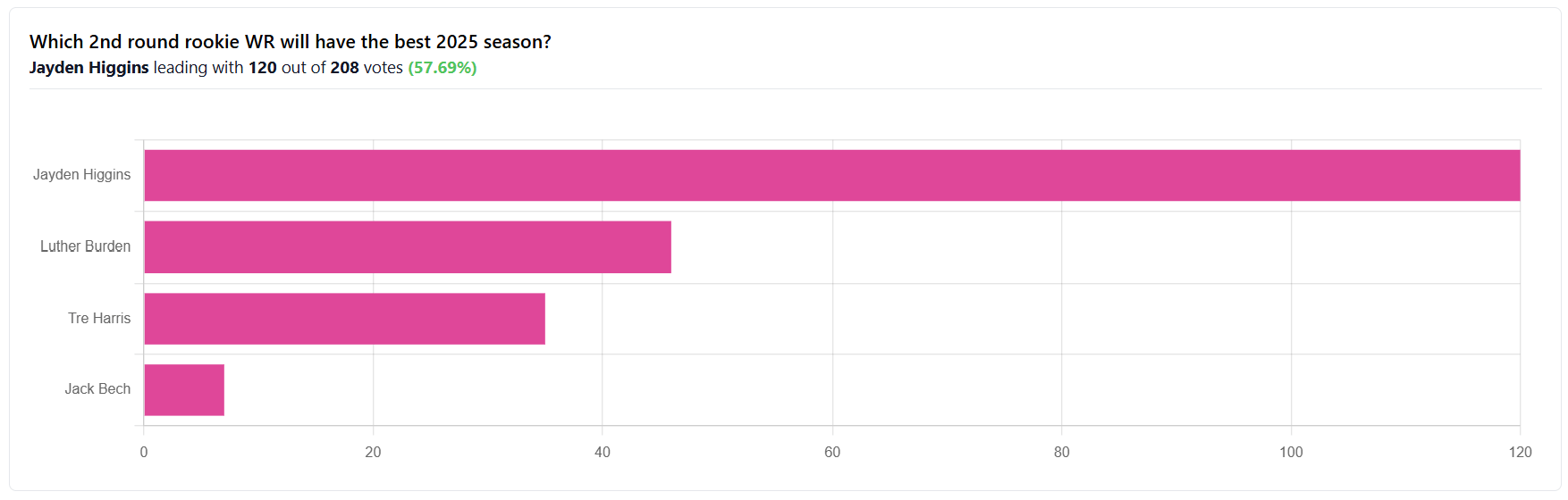 Friday I asked which 2nd round rookie WR will have the best 2025 season and more than half of you chose Jayden Higgins. Burden surpassing Harris though was a bit of an upset compared to current ADP but I agree with the sentiment and if healthy, would be comfortable even pushing him above Higgins.