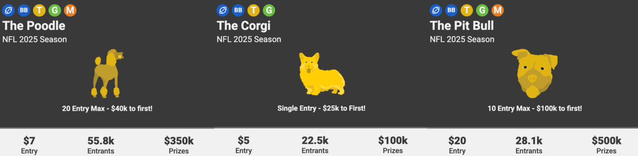Underdog launched three new best ball contests yesterday. I’ll be maxing the Corgi (1x) and Pit Bull (10x) and expect the Poodle to fill the fastest.