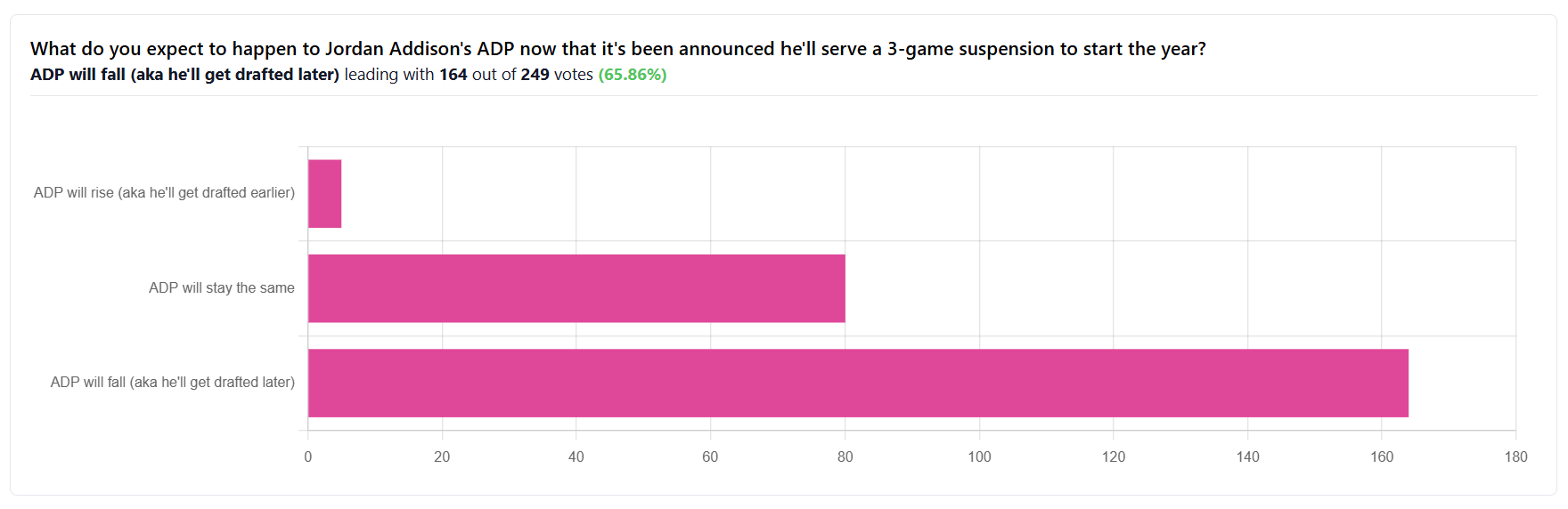 Yesterday’s poll: What do you expect to happen to Jordan Addison's ADP now that it's been announced he'll serve a 3-game suspension to start the year?