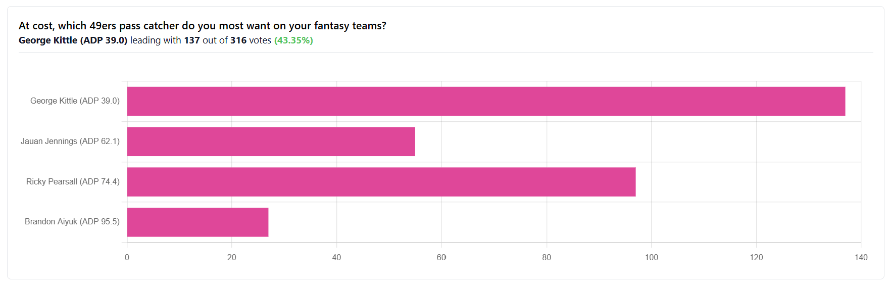 You all surprised me a bit with the responses to yesterday’s 49ers poll. It is clear the injuries and doubt surrounding both Jennings and Aiyuk are scaring drafters. These responses are likely a decent barometer for what may happen to each of these players’ ADP over the next week or two.