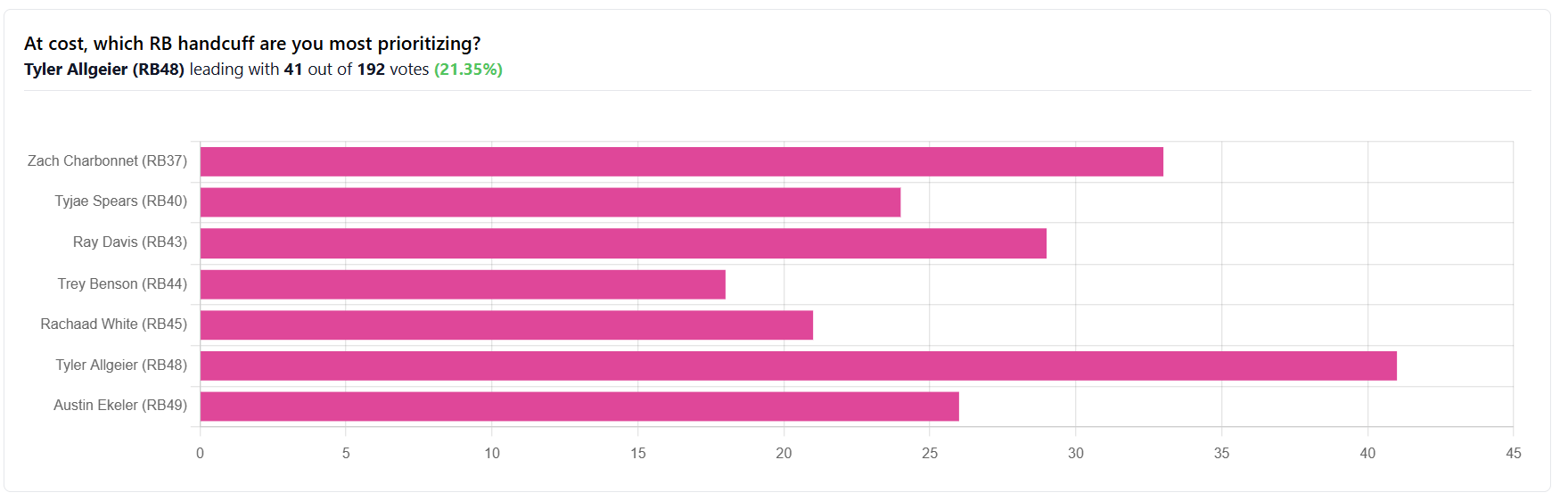 We should expect the results of yesterday’s poll to be fairly even given it accounted for current cost but across this part of the draft, these are the types of RBs I want to be overweight, usually drafted as my RB4 and/or RB5.