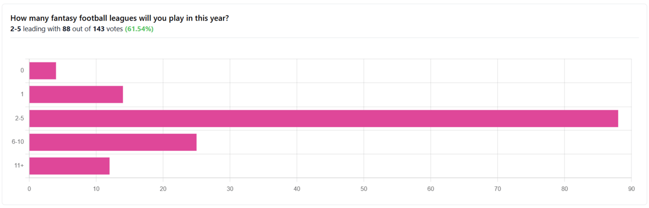 Looks like the majority of you play in 2-5 home leagues, with a blend of redraft, keeper, and dynasty. There was a time before best ball and DFS where I was in 20+ leagues, thinking the more I was in, the more info I’d get from other sharp players to win my other leagues. Nowadays, I’m just down to one keeper league with friends.
