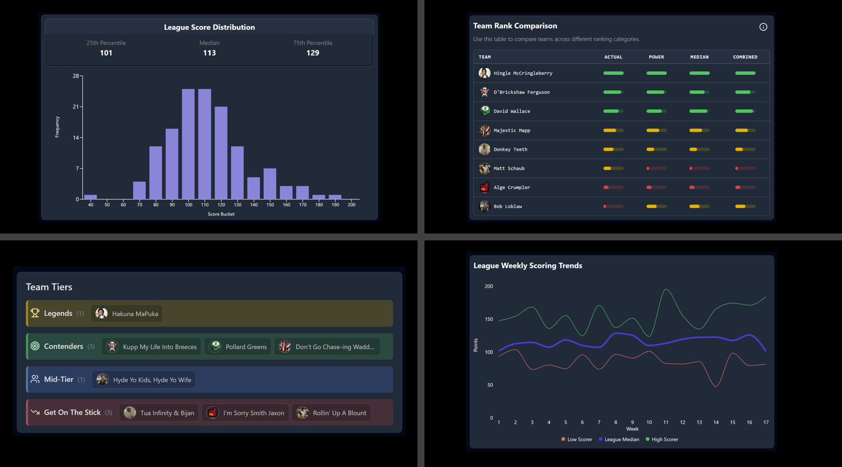 ESPN and Sleeper are fine for lineups. Fantasy Genius goes deeper: a built-in analytics hub that surfaces trends, strengths, and weaknesses across your league. Want to know who really lucked into their record or who’s getting unlucky? Want to dunk on your friends for their poor decisions? Fantasy Genius gives you the tools to do just that!